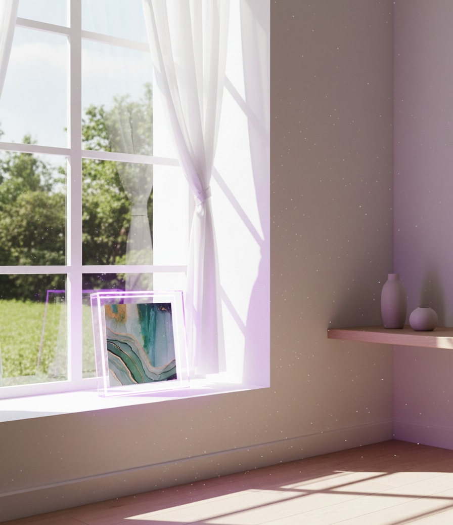 アートカプセルは、作品本来の色を100%伝えるために、透過率90%以上を誇る国産の高品質キャストアクリルを使用しています。 インクの繊細なグラデーション、ゴールドの粒子の輝き、レイヤーの奥行きを、一切のノイズなくダイレクトに網膜に届けます。研磨されたエッジ(断面)の輝きは、まるで宝石のようです。