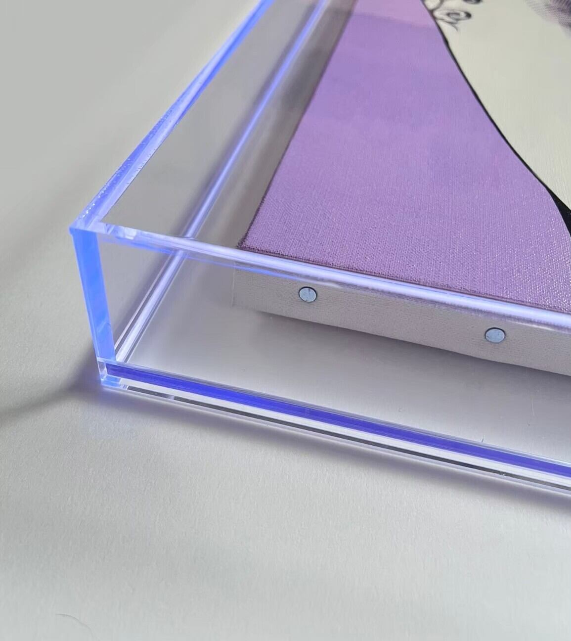 数々のアート作品を額装してきた額装家多喜博子がデザイン設計を手がけ、作品が最も美しく見える余白と空間のバランスを計算。単なる保護ではなく、アートを際立たせるためのボックスフレームとして、厳選した高品質な素材を使用し、国内で一点ずつ丁寧に制作しています。